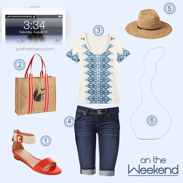 The look: 1) sandals; 2) tote; 3) t-shirt; 4) shorts; 5) hat and 6) necklace.
