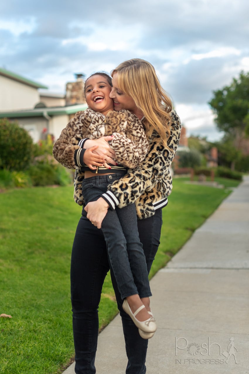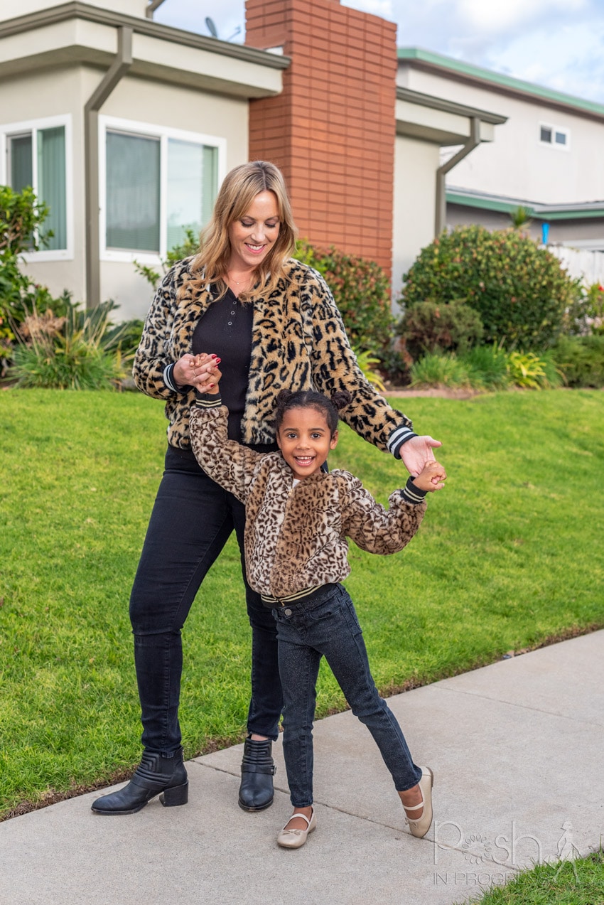 When I found this coat for my daughter, I just knew I wanted to do a twinning shoot with her. There are a couple reasons for that. First, she really loves dressing and looking like me. Second, she was so excited by this jacket that I knew she’d be even more excited if we both wore one. As you can see, we had so much fun and I think the photos show just how much we love each other. Honestly, these might be my favorite pictures of all time with her. I love this girl so much and the animal print bomber definitely captures her personality. I’m loving the personal style she already expresses, so I’m going to help her dress it just as she likes.