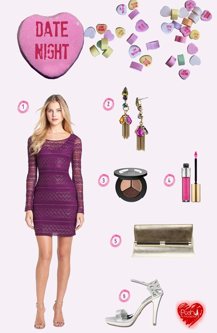 I’m all about rocking a red dress for v-day, but why not try another romantic color that still conjures images of cupid? Vibrant purple is still feminine but not as obvious as red. I like the sheer look of this dress because it is sexy but still covered up. Pairing the dress with metallic heels and clutch is more dramatic than standard black options. Gem-tone dangling earrings draw attention to your face and compliment the color of the dress. Assuming you live in a cooler climate, you will need a simple topcoat to keep you warm. I love winter white coats because the color is more elegant and would look great with the metallic pieces in the look. A bronzed eye and pink glossy lips will complete this look.