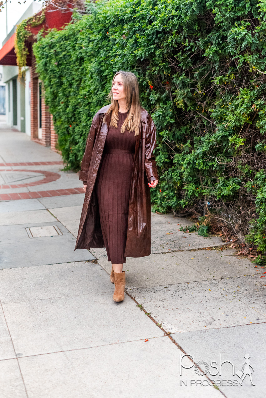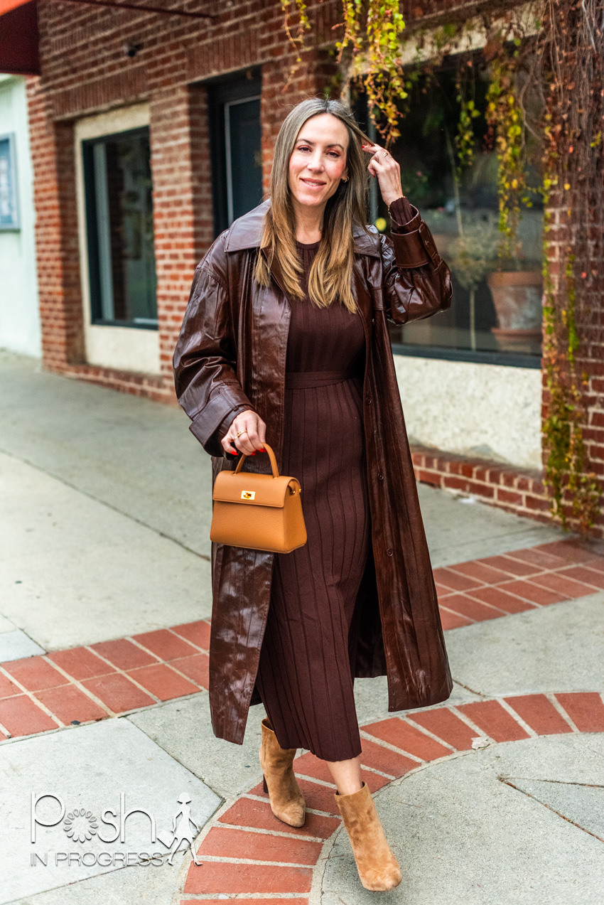 {Stacey’s Look: Dress; Booties (similar, similar); Trench; Bag (similar, similar, similar)}