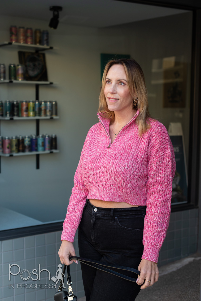 For me, the big thing about this trend was finding a sweater that I thought was figure flattering. The reason I like my half-zip sweater is that it’s cropped. I also love the color. Most of the half-zips I saw were in really basic neutrals. I’m not really into basics unless they have a design element that makes them really stand out. For me, the color and cropped fit do make this sweater more unique and also much more a style I like.