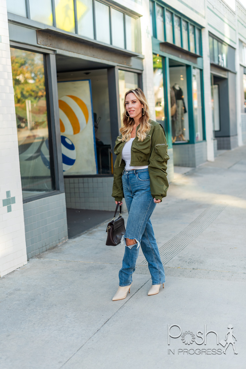 (Stacey’s Look: Jacket (similar, similar), Jeans, Top, Bag, Earrings, Booties (similar)}
